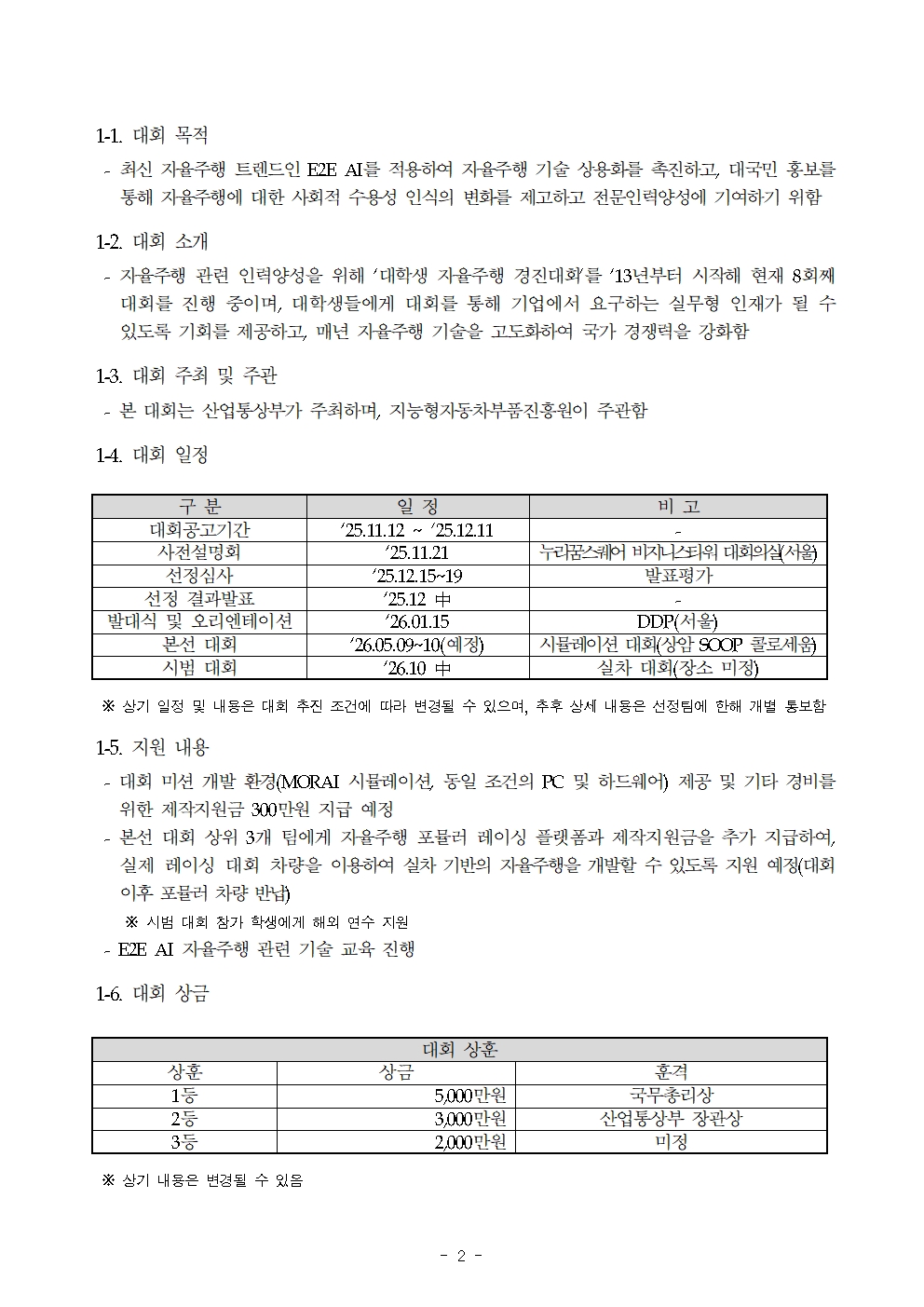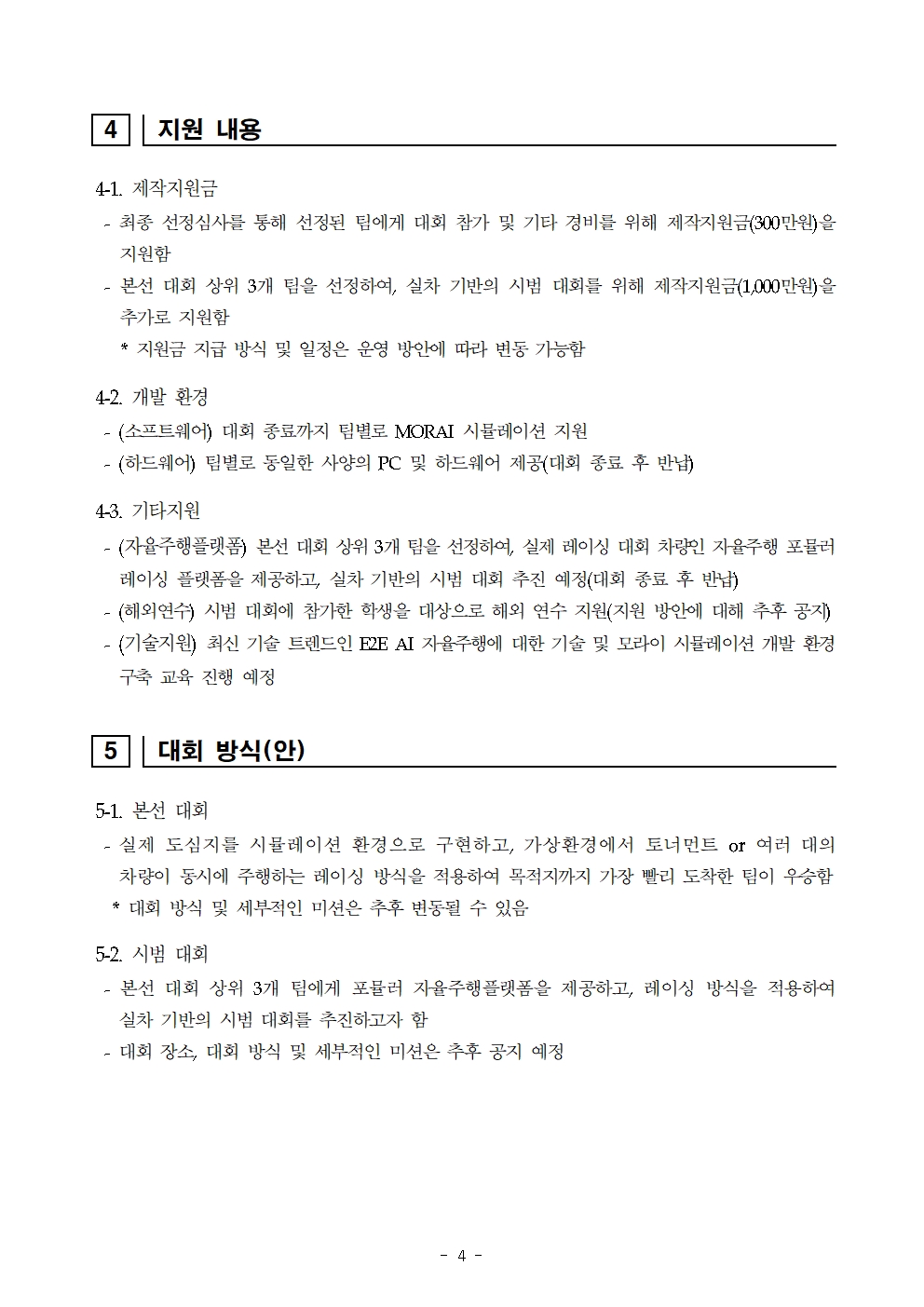 첨부파일 : A1 자율주행 챌린지 2026 연구개발계획서_학교명_팀명.hwp (54 kb) A1 자율주행 챌린지 2026 참가신청서_학교명_팀명.hwp (43 kb)