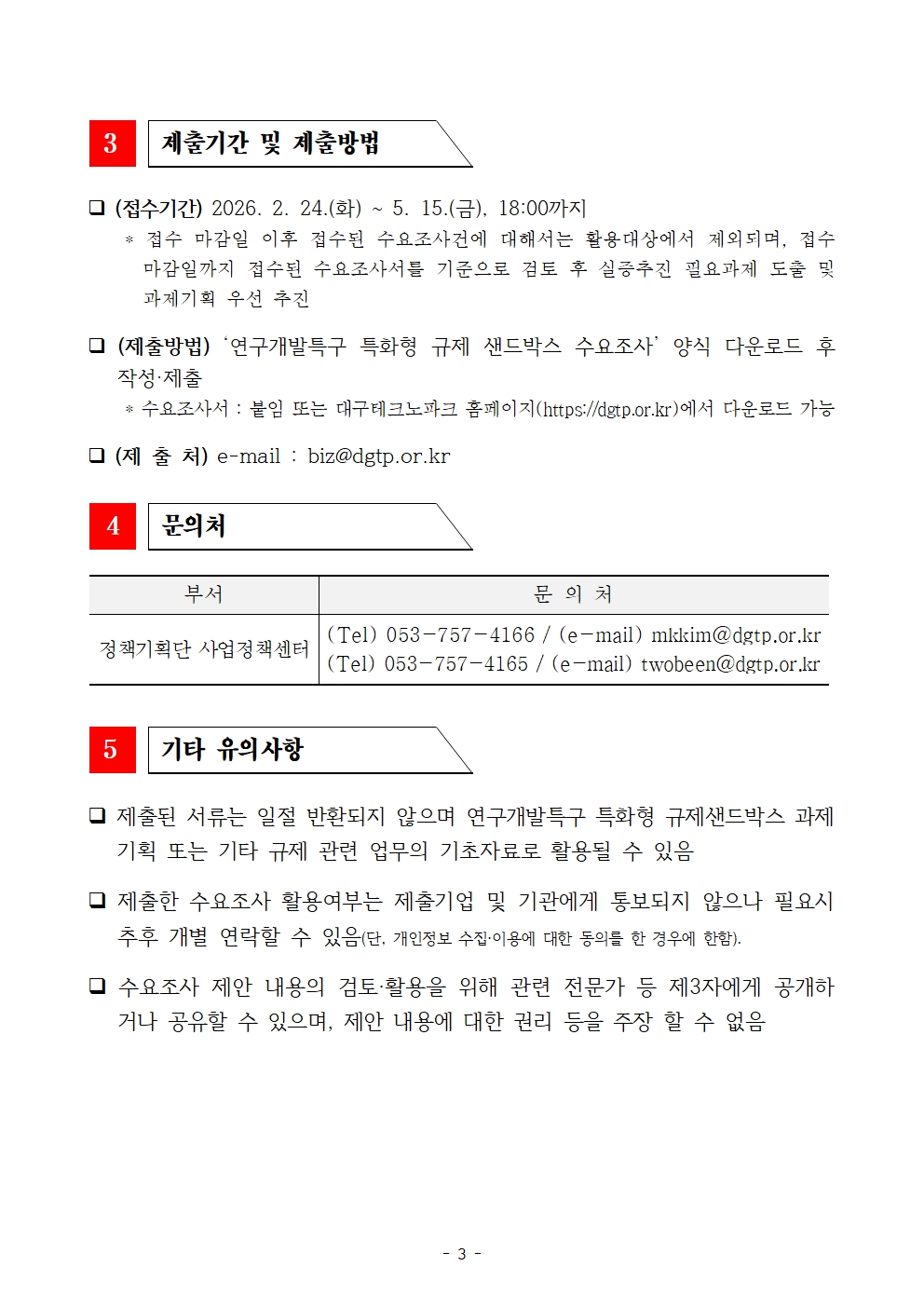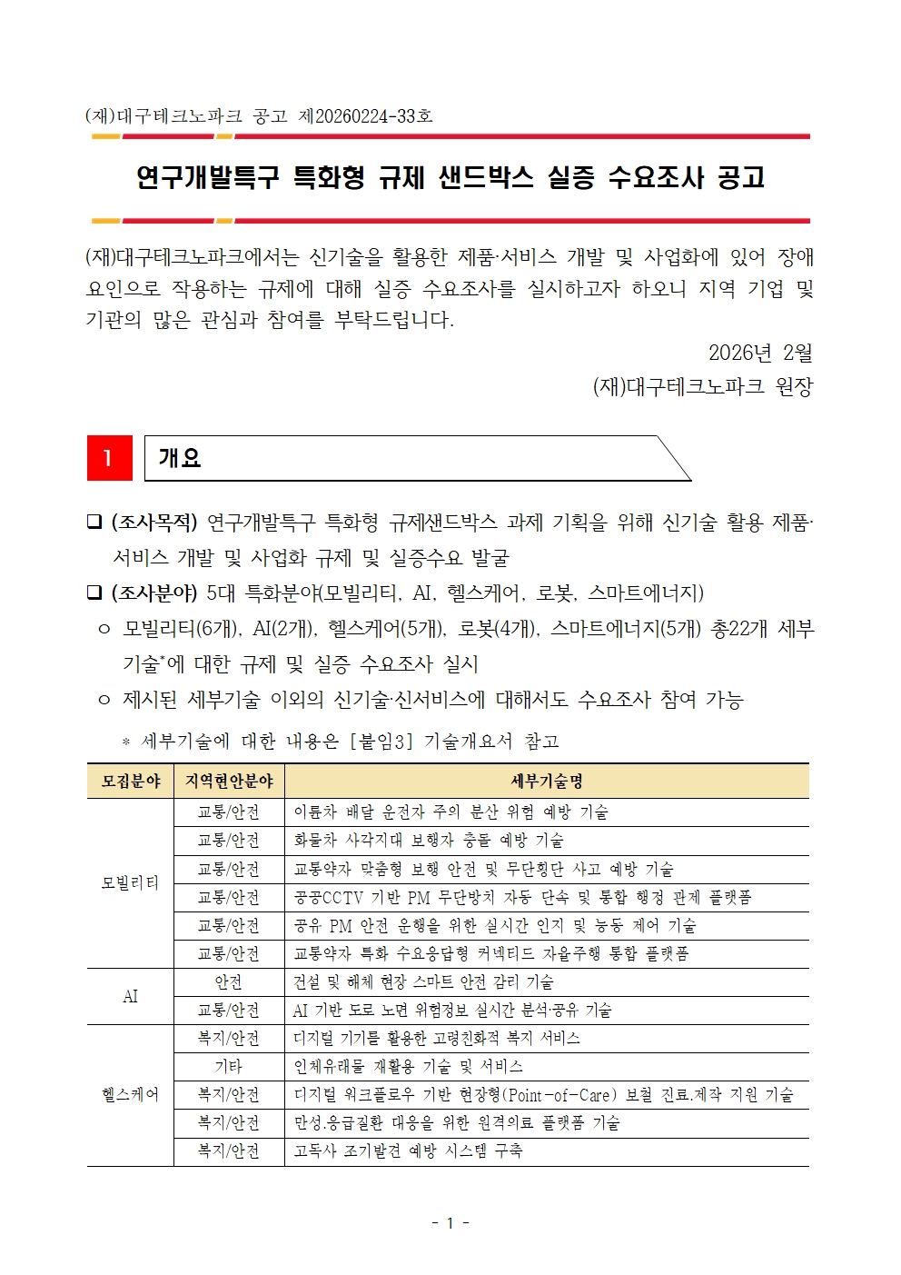 첨부파일 : [붙임1]연구개발특구 특화형 규제샌드박스 실증 수요조사 양식.hwpx (63 kb) [붙임2]작성요령.hwpx (78 kb) [붙임3]기술개요서_5대분야.hwpx (1584 kb)