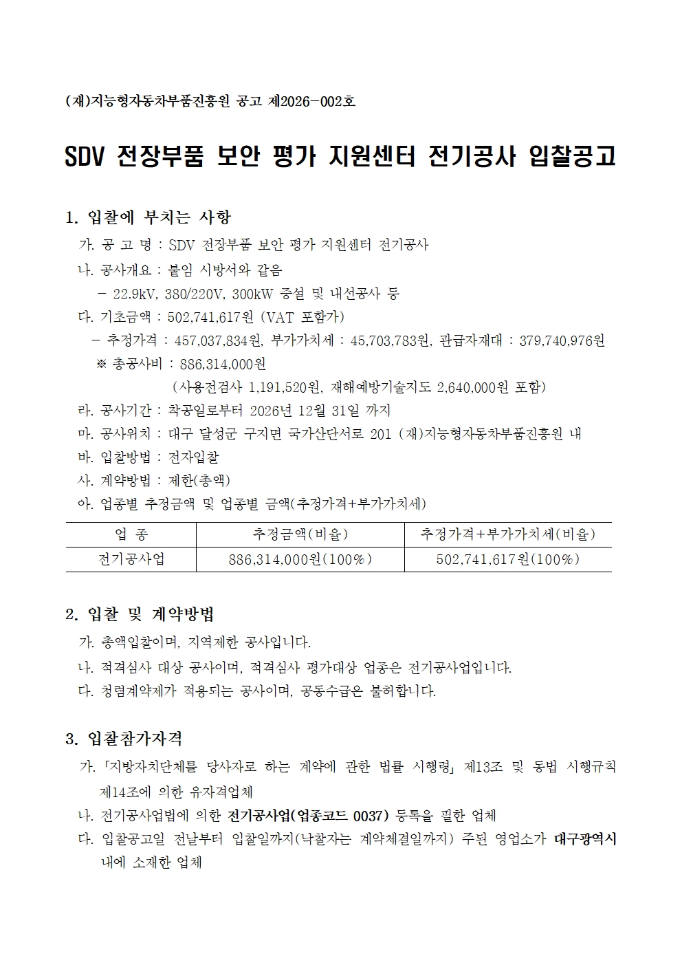 첨부파일 : 시방서(전기).hwp (247 kb) SDV보안평가지원센터전기공사 (공내역서).xlsx (268 kb) 입찰공고문.hwp (143 kb)