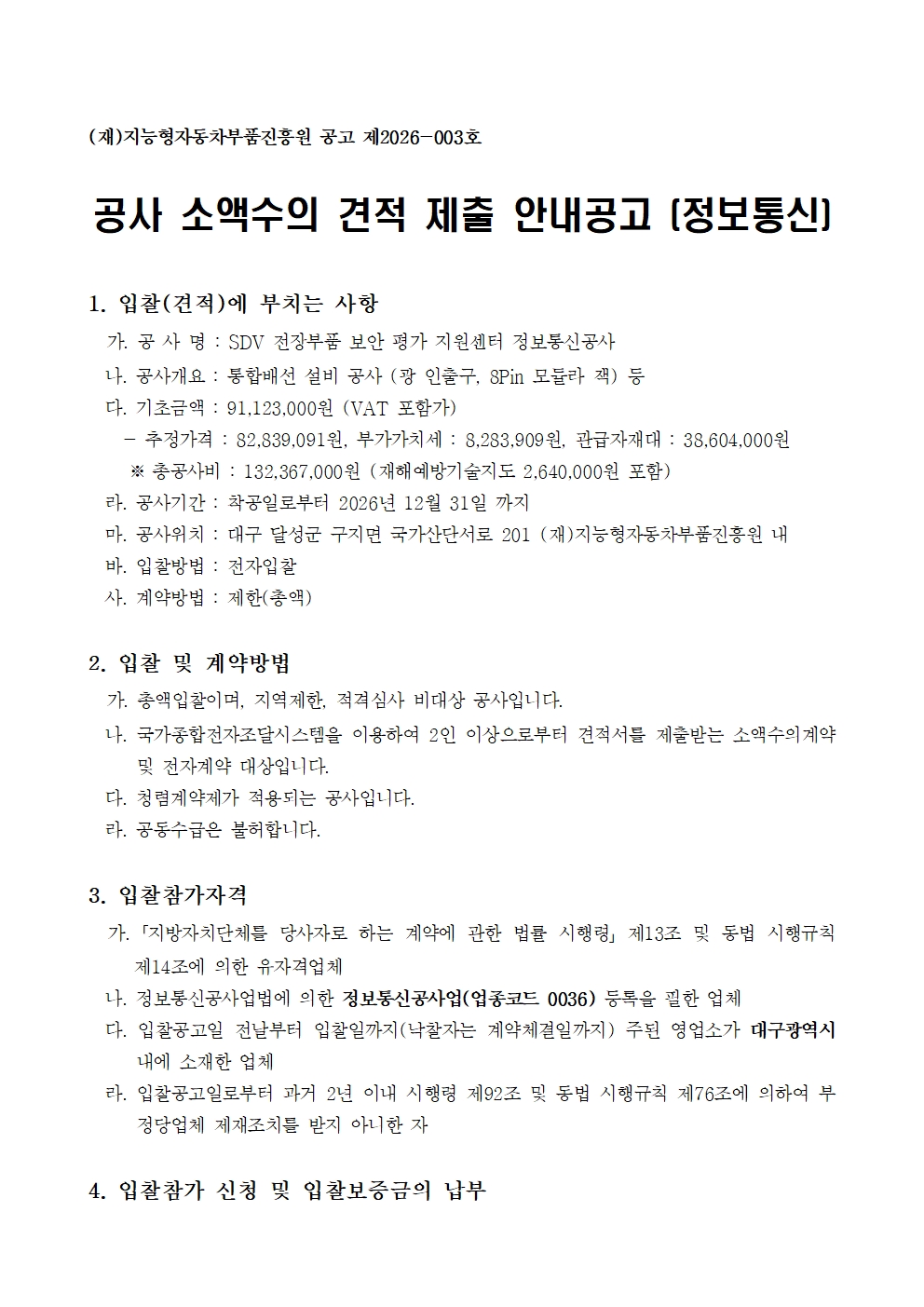 첨부파일 : 공고문(정보통신).hwp (75 kb) 시방서(정보통신).hwp (147 kb) SDV보안평가지원센터정보통신공사 (공내역서).xlsx (120 kb)