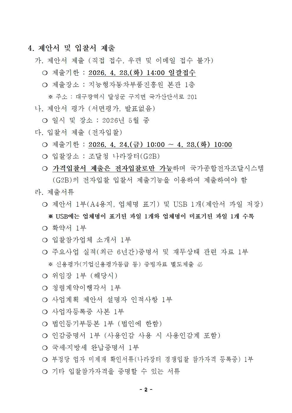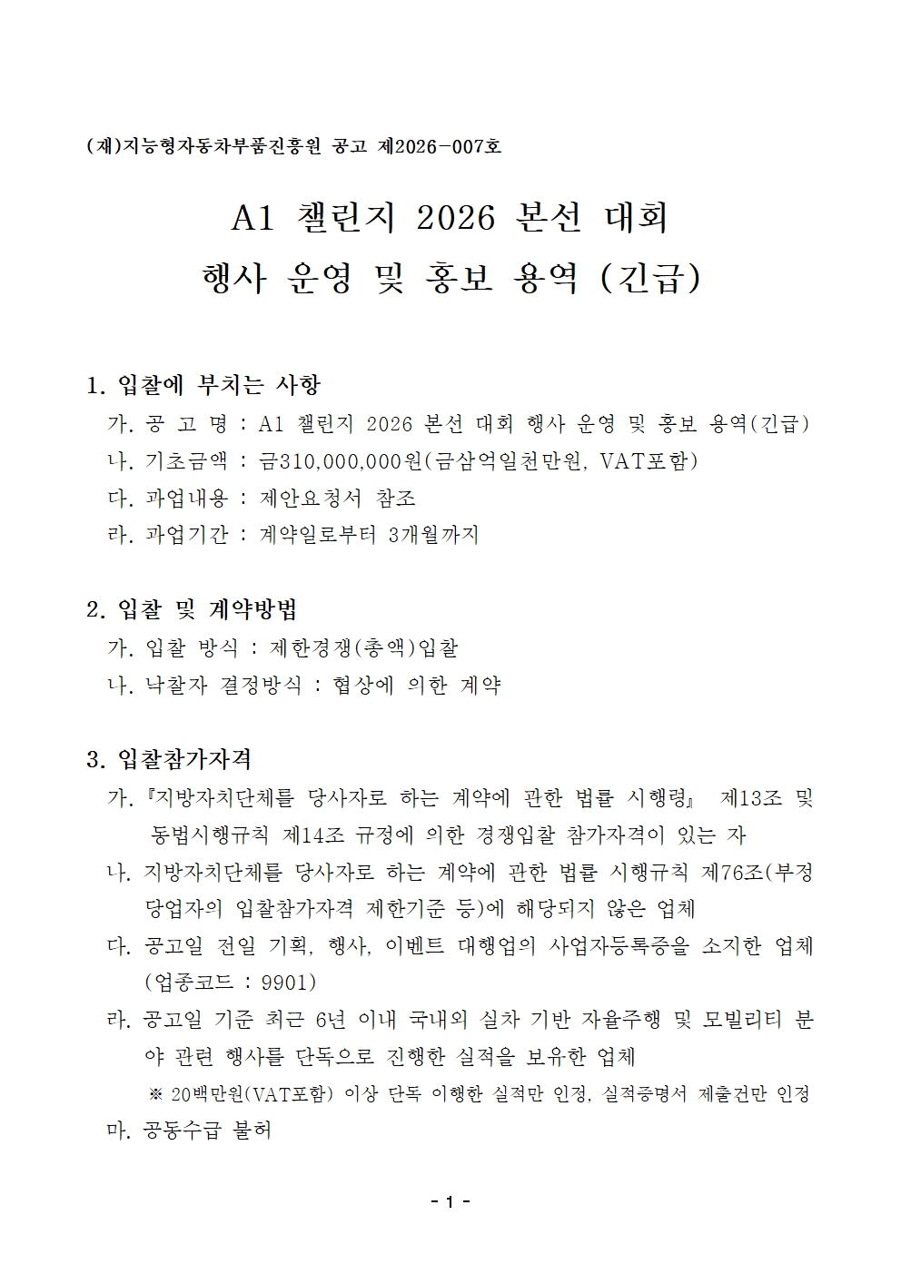 첨부파일 : 입찰공고문.hwp (134 kb) 제안요청서_A1 챌린지 2026 본선 대회 행사운영 및 홍보_260409.hwp (386 kb)