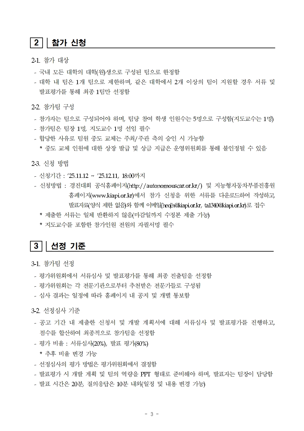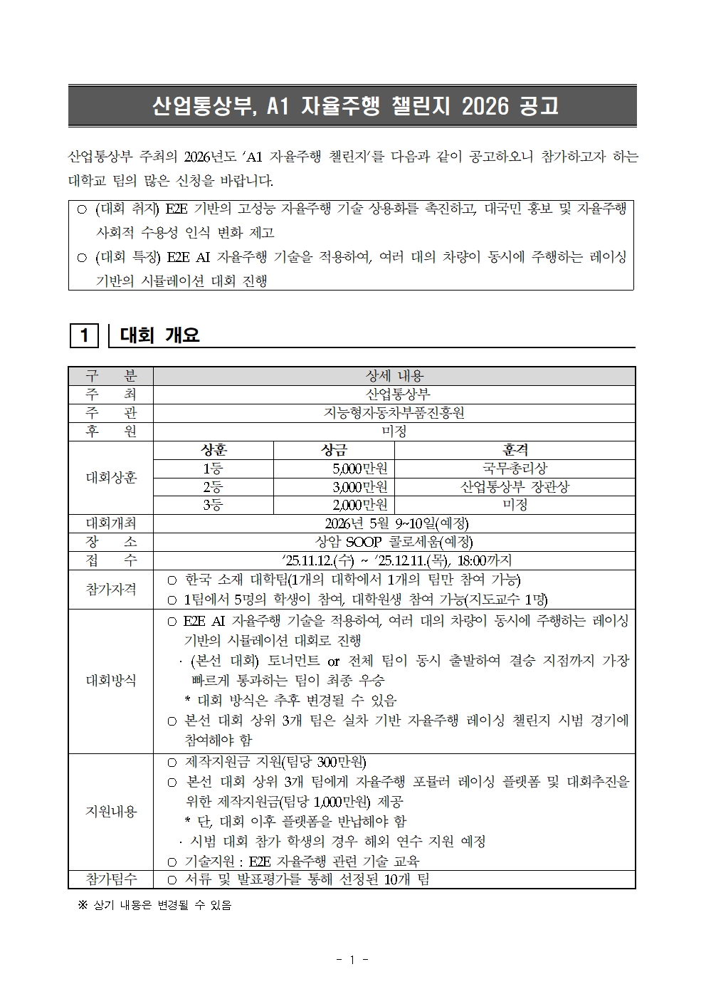 첨부파일 : A1 자율주행 챌린지 2026 연구개발계획서_학교명_팀명.hwp (54 kb) A1 자율주행 챌린지 2026 참가신청서_학교명_팀명.hwp (43 kb)