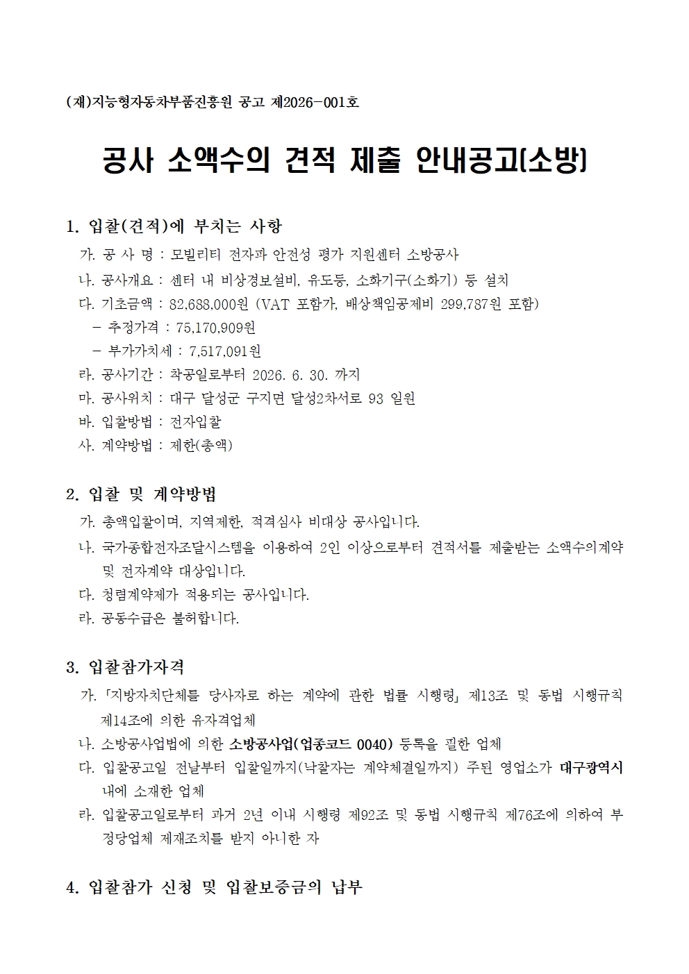 첨부파일 : 공고문(소방).hwp (140 kb) 소방 - 시방서.hwp (367 kb) 모빌리티전자파안전성평가지원센터건립전기소방공사 내역서(공내역서).xlsx (31 kb)