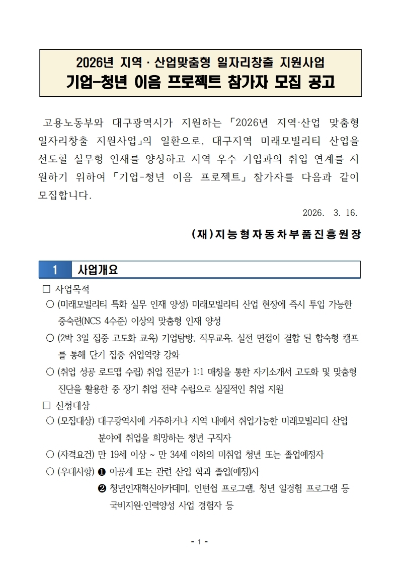 (수정) 2026년 지역·산업맞춤형 일자리창출 지원사업 기업-청년 이음 프로젝트 참가자 모집 공고